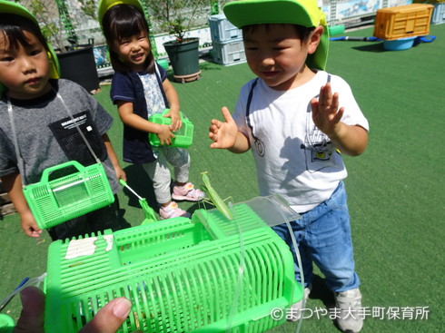 園庭を逃げ回るカマキリをパパラッチする2歳児チームでした(笑)