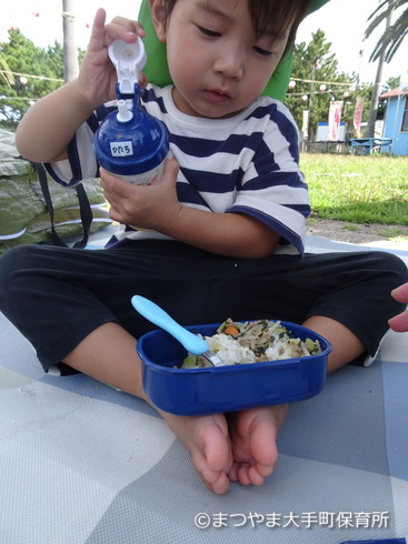 男の子がお茶を飲むときに、お弁当箱を置く場所を開発