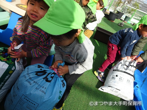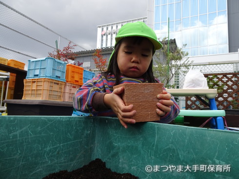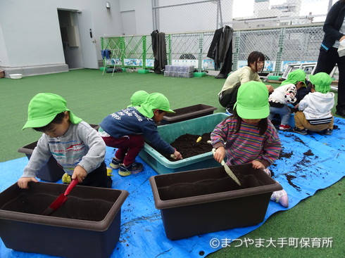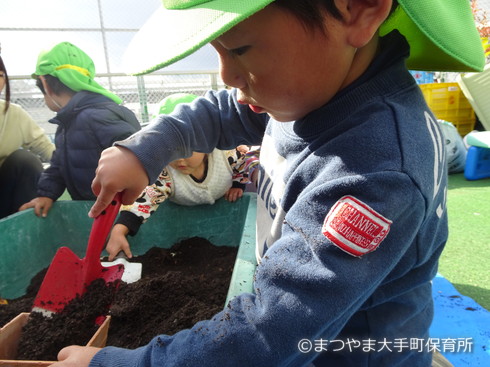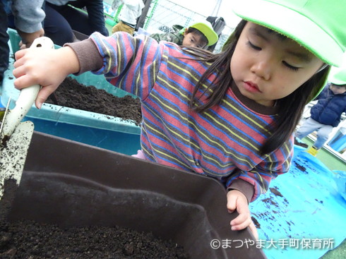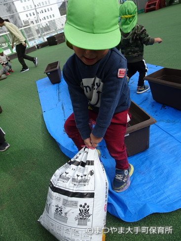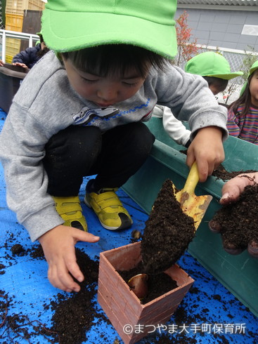 それじゃ トロ箱に入った土を植木鉢に入れていってね