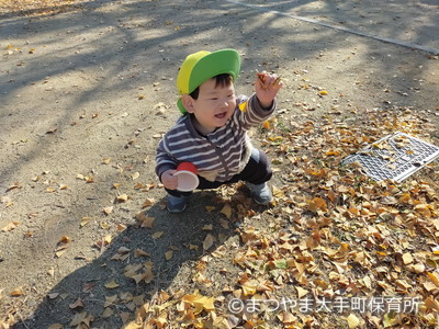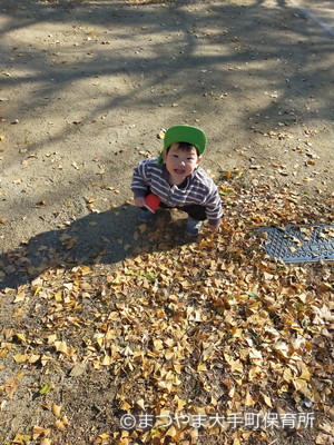 先生がパラパラ~と葉っぱのシャワーを降らせた!僕もやってみる!