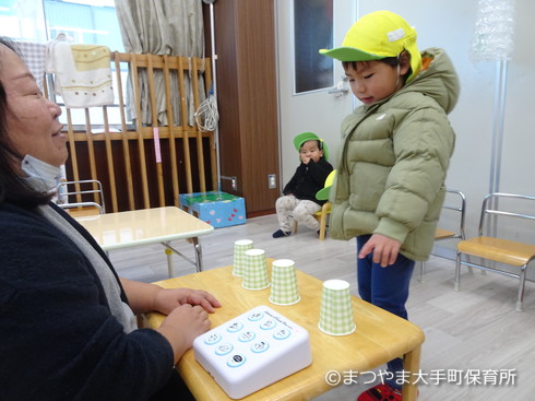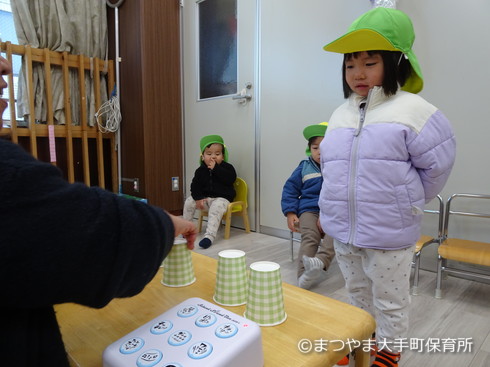 4つの紙コップの中に1つだけスタンプを入れて