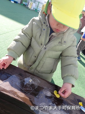 剣みたいな氷をみつけて、そーっと壊れないように置くんだ!