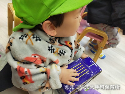 今日はお散歩前に、2歳児チームさんの楽器練習をちょっぽり見学