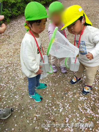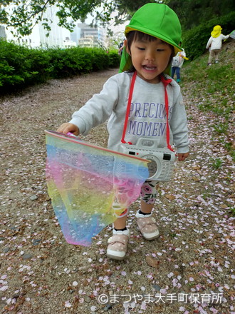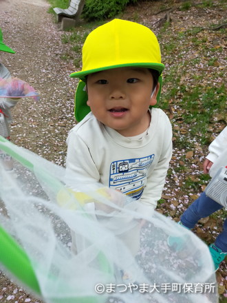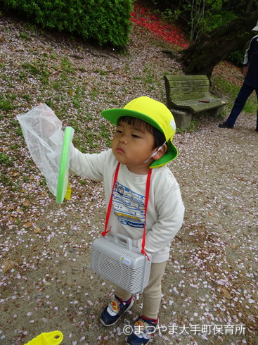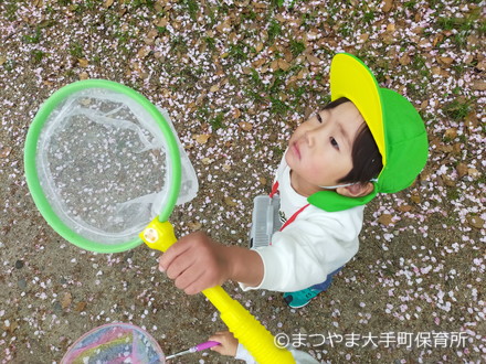 いつの間にか網で桜の花びらをとることに夢中に♫