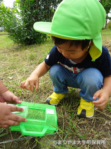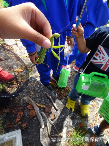 ひとりでカマキリをつかまえてカゴに入れる男の子でした(スゴイ!)